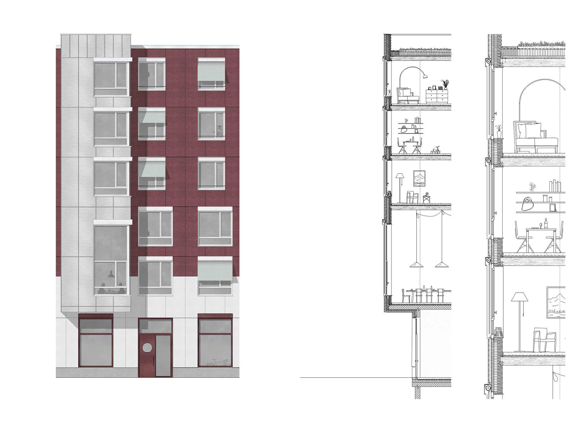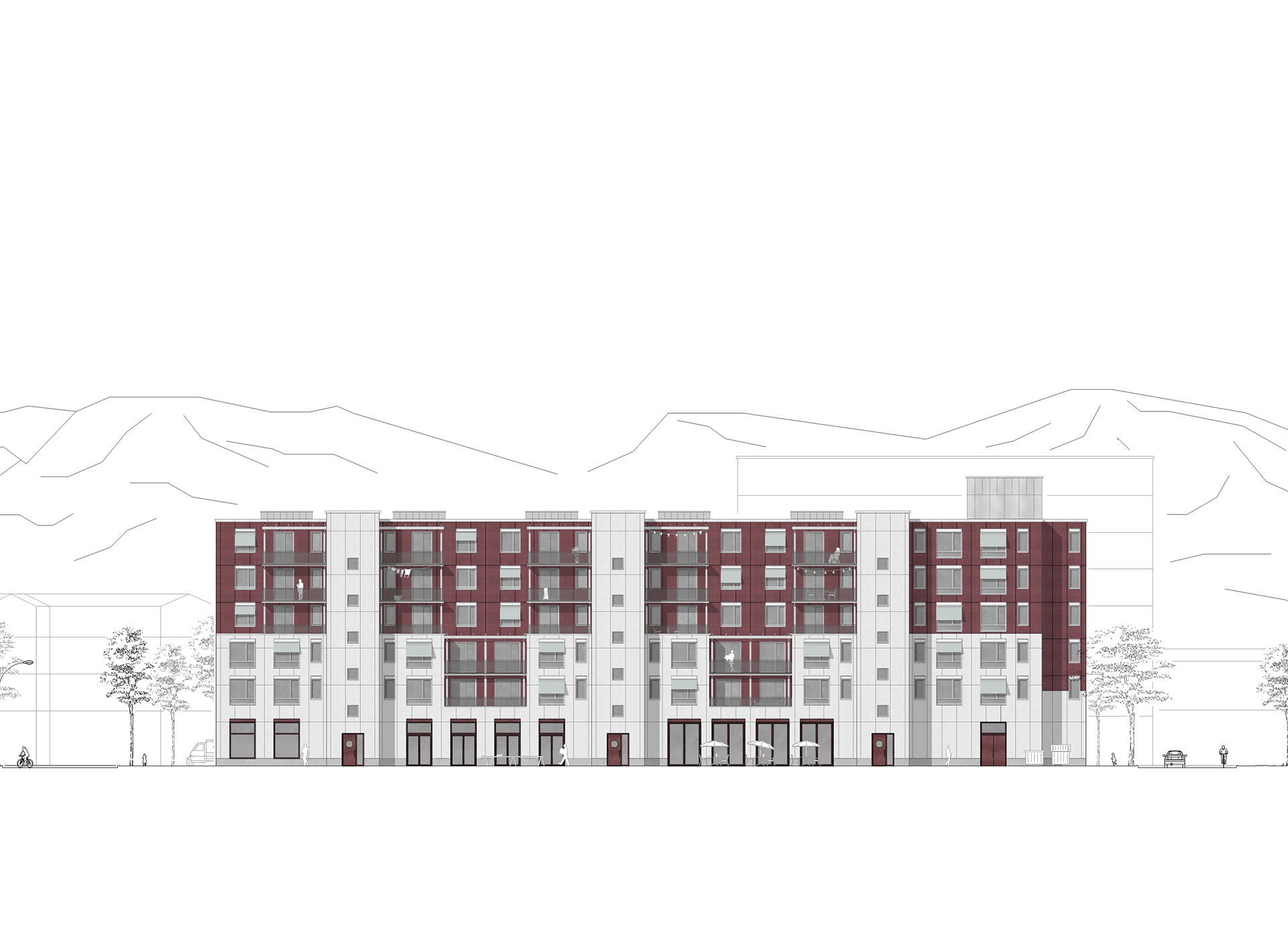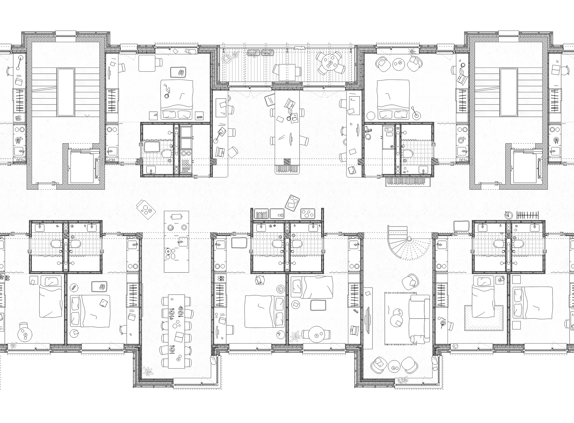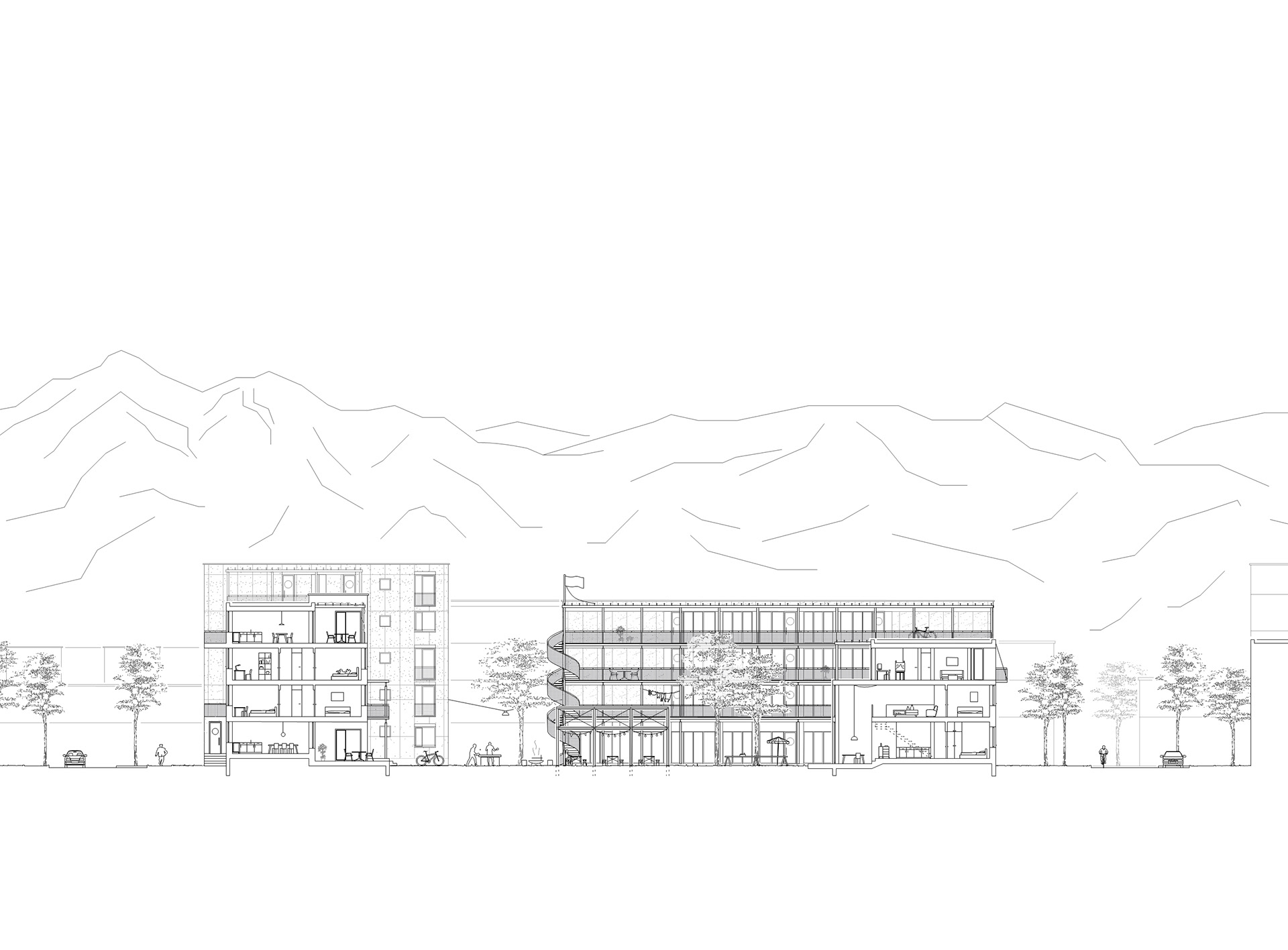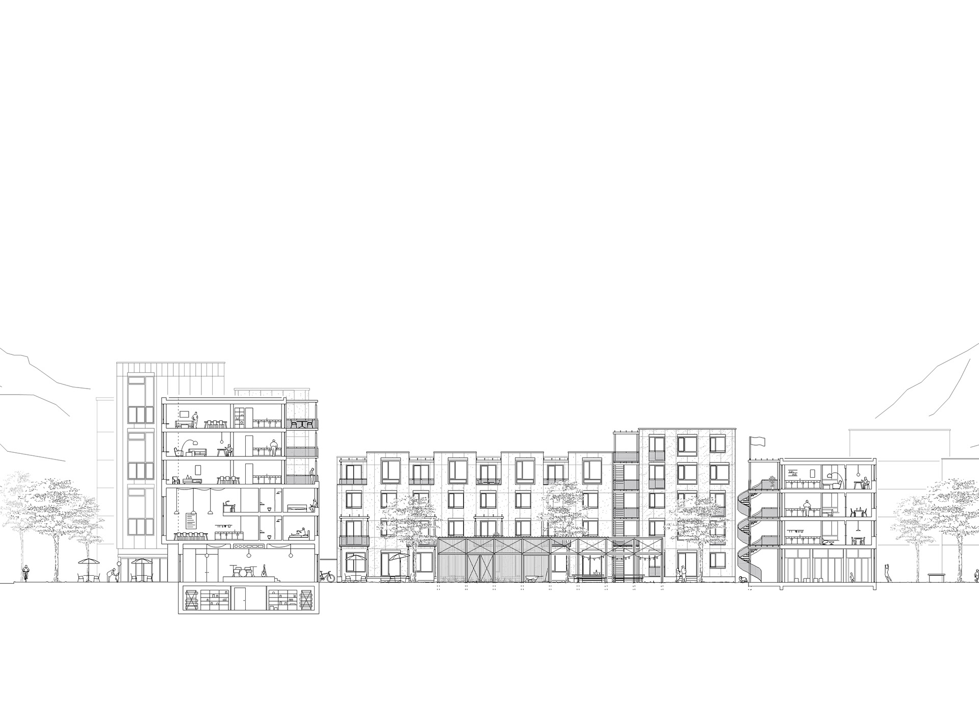 Das Hauptaugenmerk liegt beim Haus am Marktplatz. Während es im Erdgeschoss öffentliche Nutzungen aufnimmt, bietet es in vier Wohngeschossen neben konventionellem auch Platz für experimentelles Kollektiv-Wohnen, welches von Grandhotel-Grundrissen inspiriert ist.