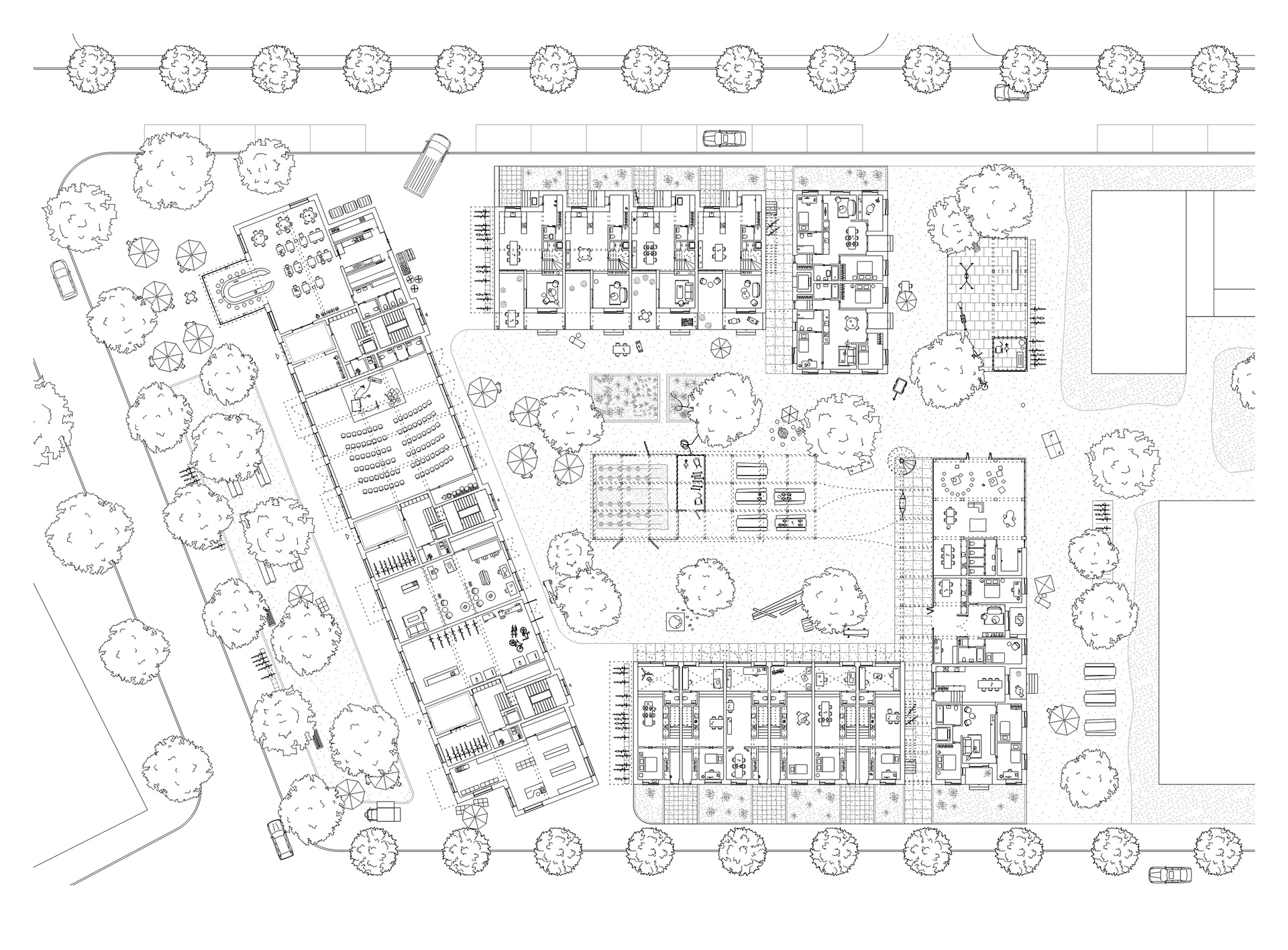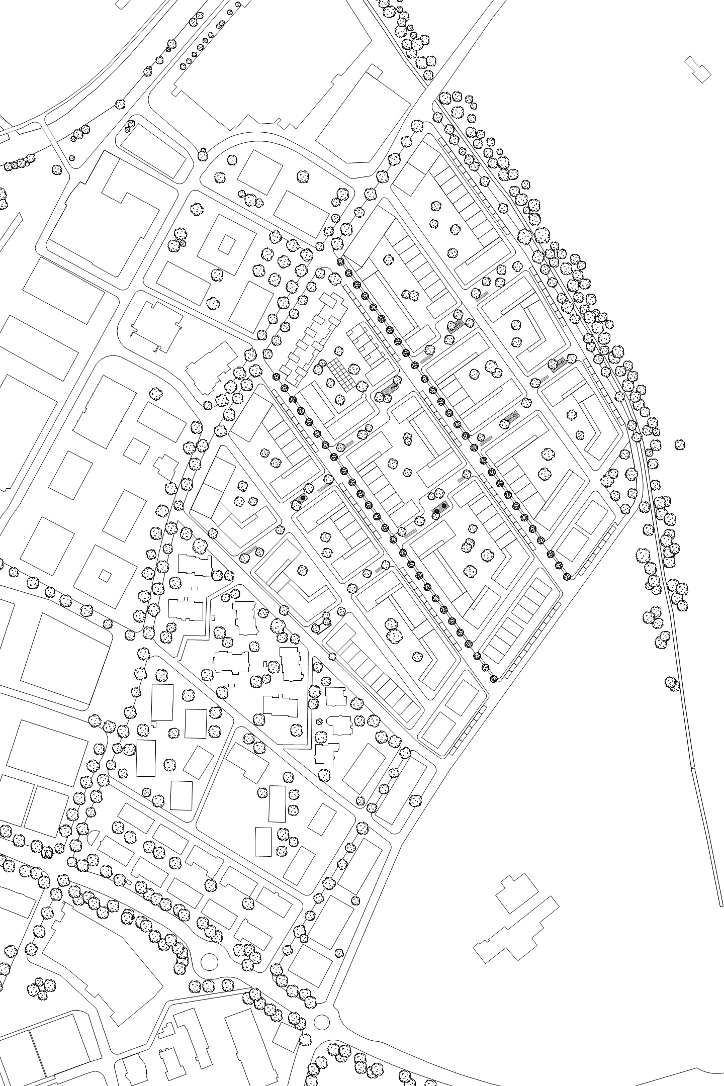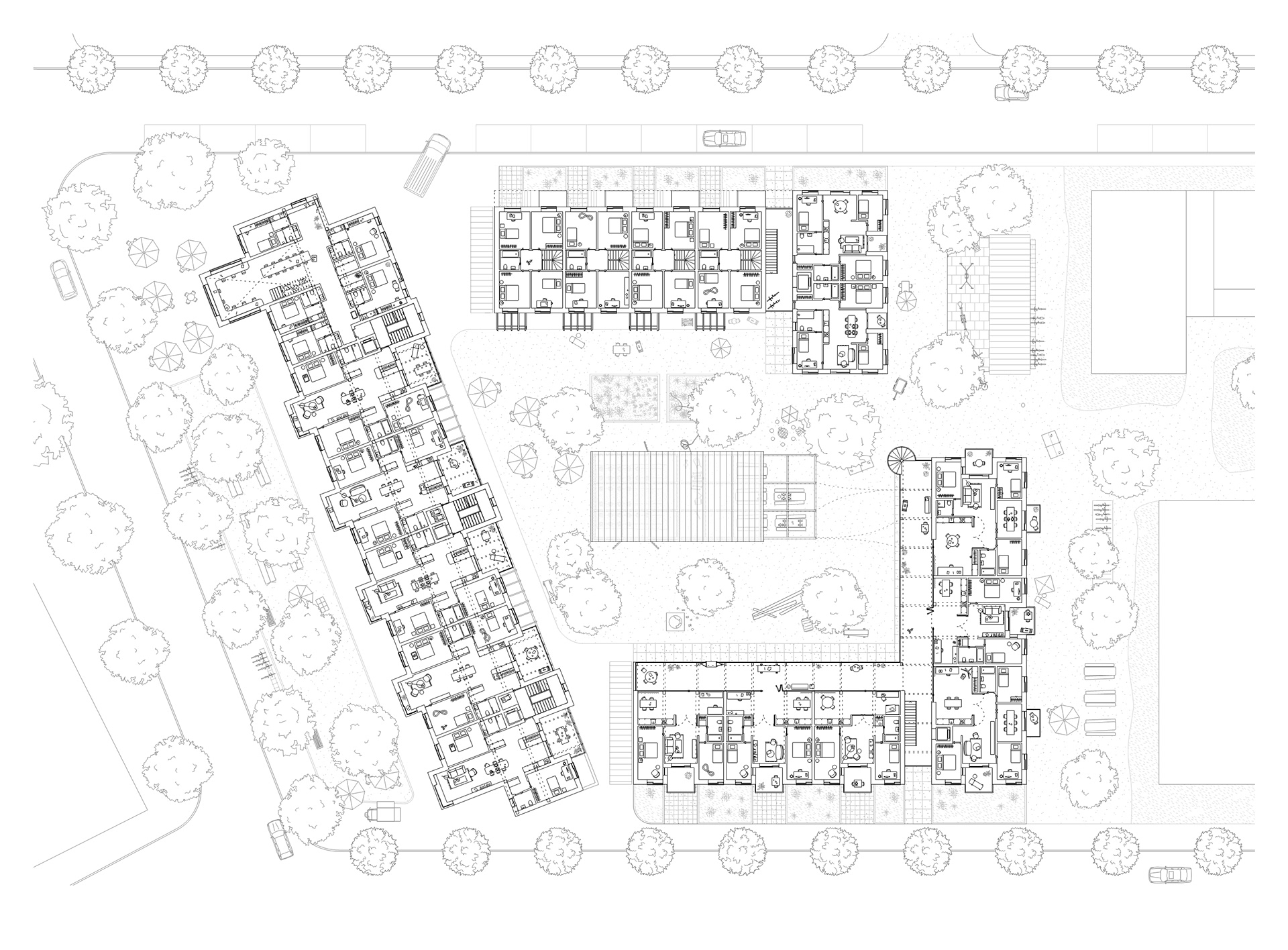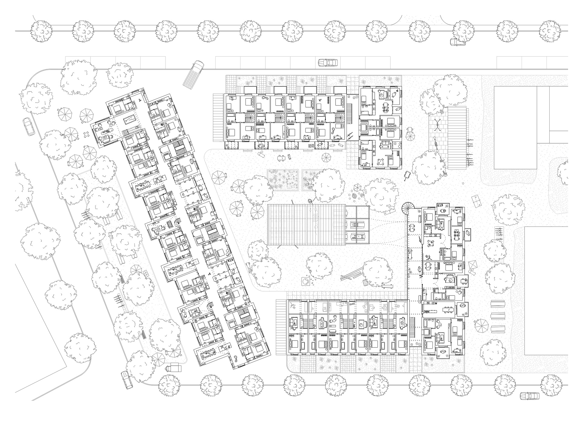 Als erste Etappe der städtebaulichen Umsetzung kommt der Parzelle am Platz eine besondere Bedeutung zu. Sie ist Ort des Experiments und Prüfstand für die Entwicklungsvision. Hier sollen verdichtete Agglomerationstypologien und neuartige Wohnformen koexistieren und ihre Tragfähigkeit für die weiteren Bauetappen getestet werden. Die differenzierten Typologien des aufgelösten Blockrands bieten Platz für eine heterogene Bewohnerschaft: Gestapelte Reihenhäuser, Laubengangtypen und kompakte Geschosswohnungen gruppieren sich in verdichteter Form um einen Innenhof mit offenen Baustrukturen zur Aneignung, Pflanzgärten und Spielflächen.